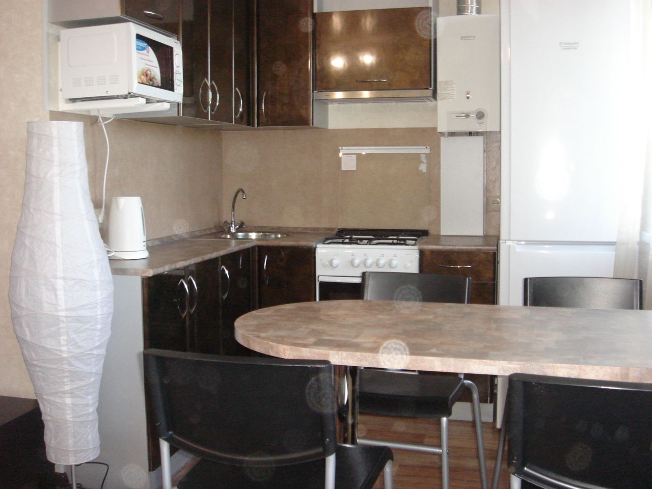 Кухонный гарнитур, стол со стульями, кровать, большой раскладной диван, шкаф-купе, прикроватные тумбочки, утюг с гладильной доской.